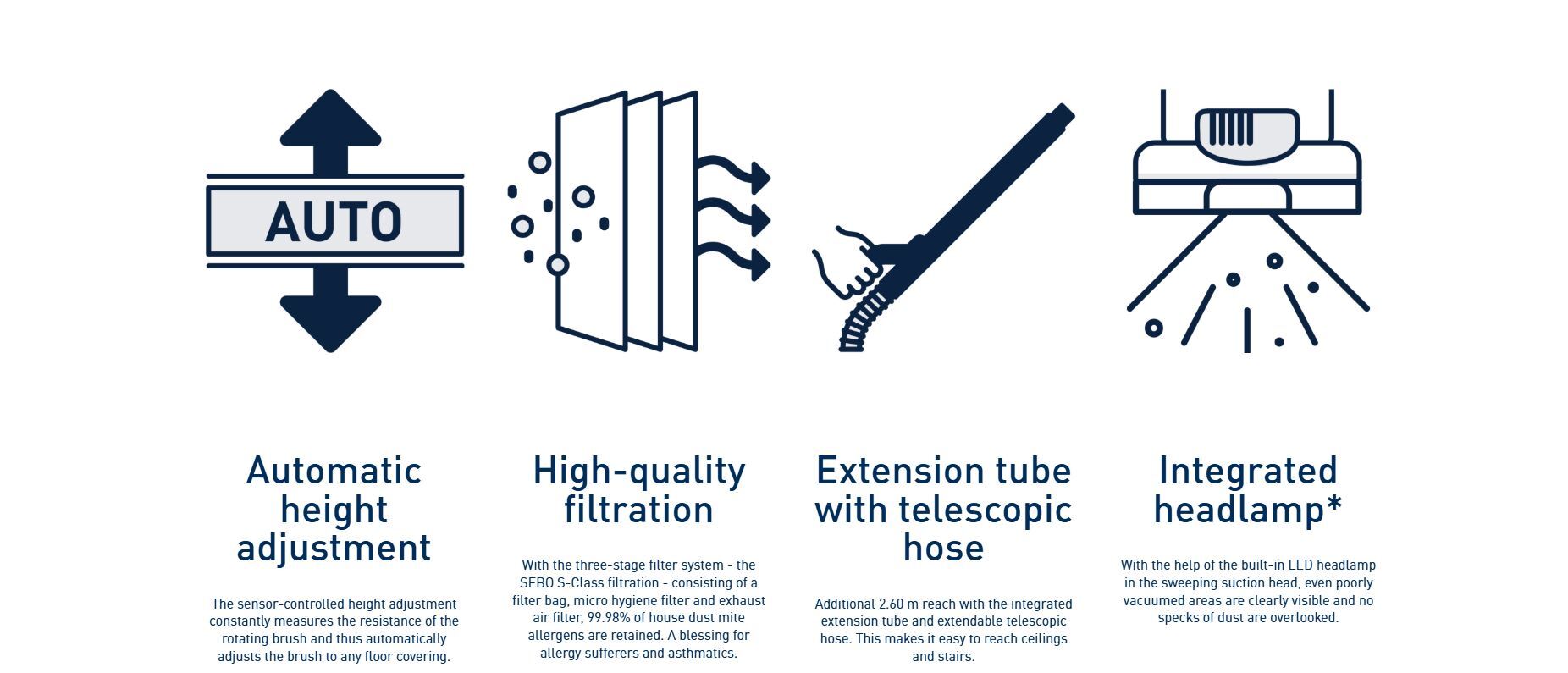 The SEBO AUTOMATIC X is equipped with a three-stage filter system, consisting of the filter bag, the upstream micro-hygiene filter and the exhaust air filter in the blow-out area. The allergy-friendly filtration guarantees a long service life and achieves top results.